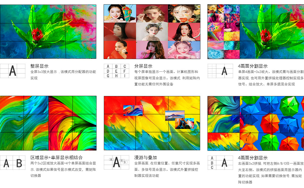 ②智能拼接,任意組合:客戶需求,怎么顯示怎么來;個(gè)性化個(gè)性設(shè)計(jì)、靈活多變、滿足不同需求、支持定制;多樣化的圖像拼接顯示,可以整屏顯示、分屏顯示、多畫面分割顯示、區(qū)域顯示加單屏顯示相結(jié)合、漫游與疊加。